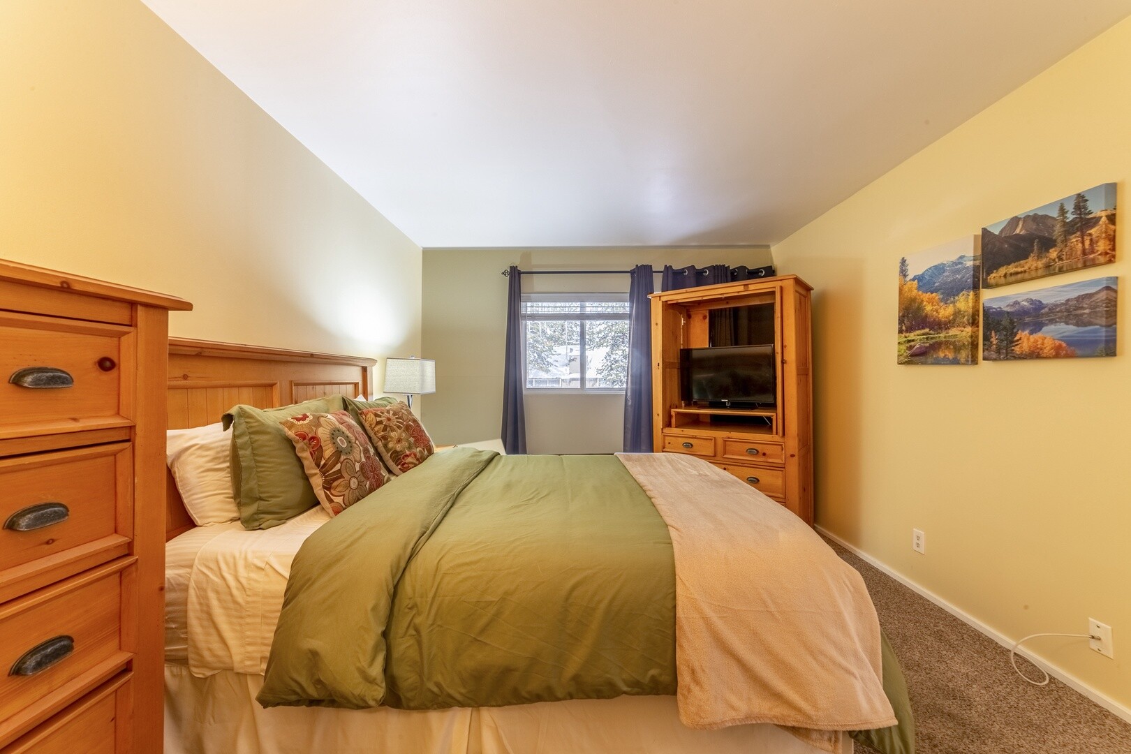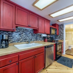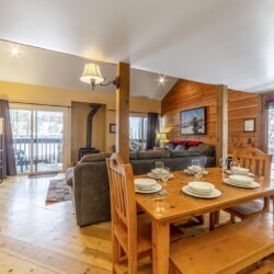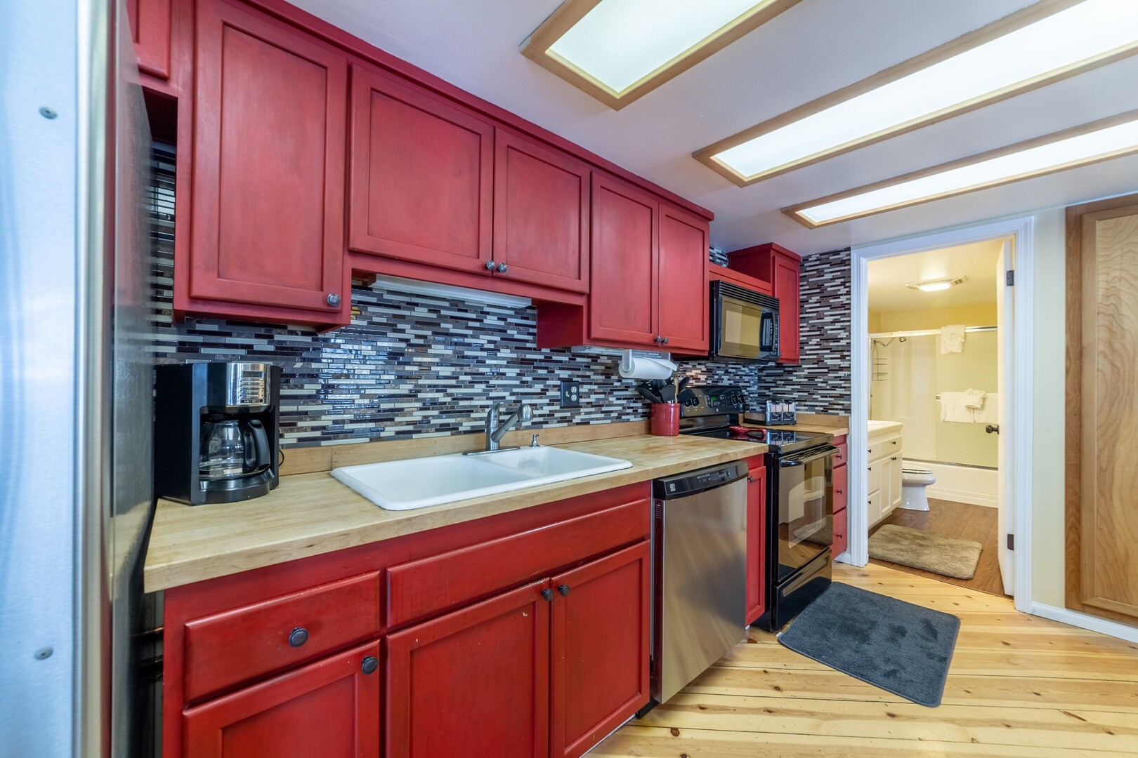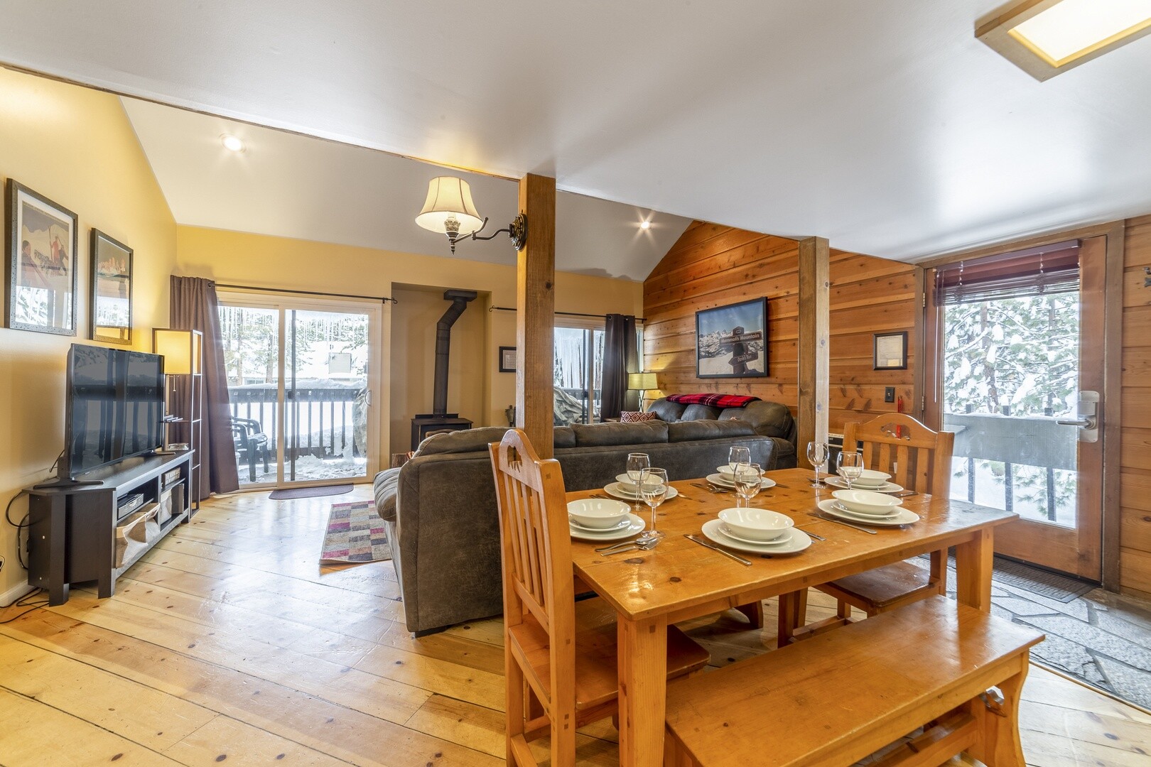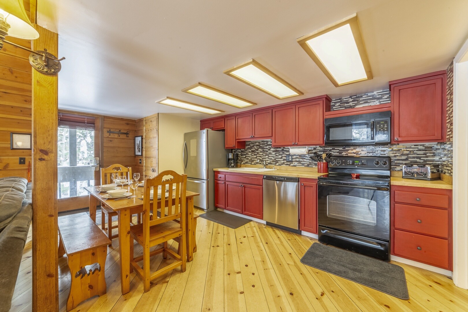 This corner unit is located on the second floor (full flight of stairs to front door) and has an open and spacious floor plan. The condo is equipped with a fully stocked kitchen for your cooking convience. The living room has two full size couches, electric wall heater and a wood burning stove. In the warmer months, enjoy the patio located immediately off of the living room. In addition, the free wifi service and large Smart TV support your streaming needs.