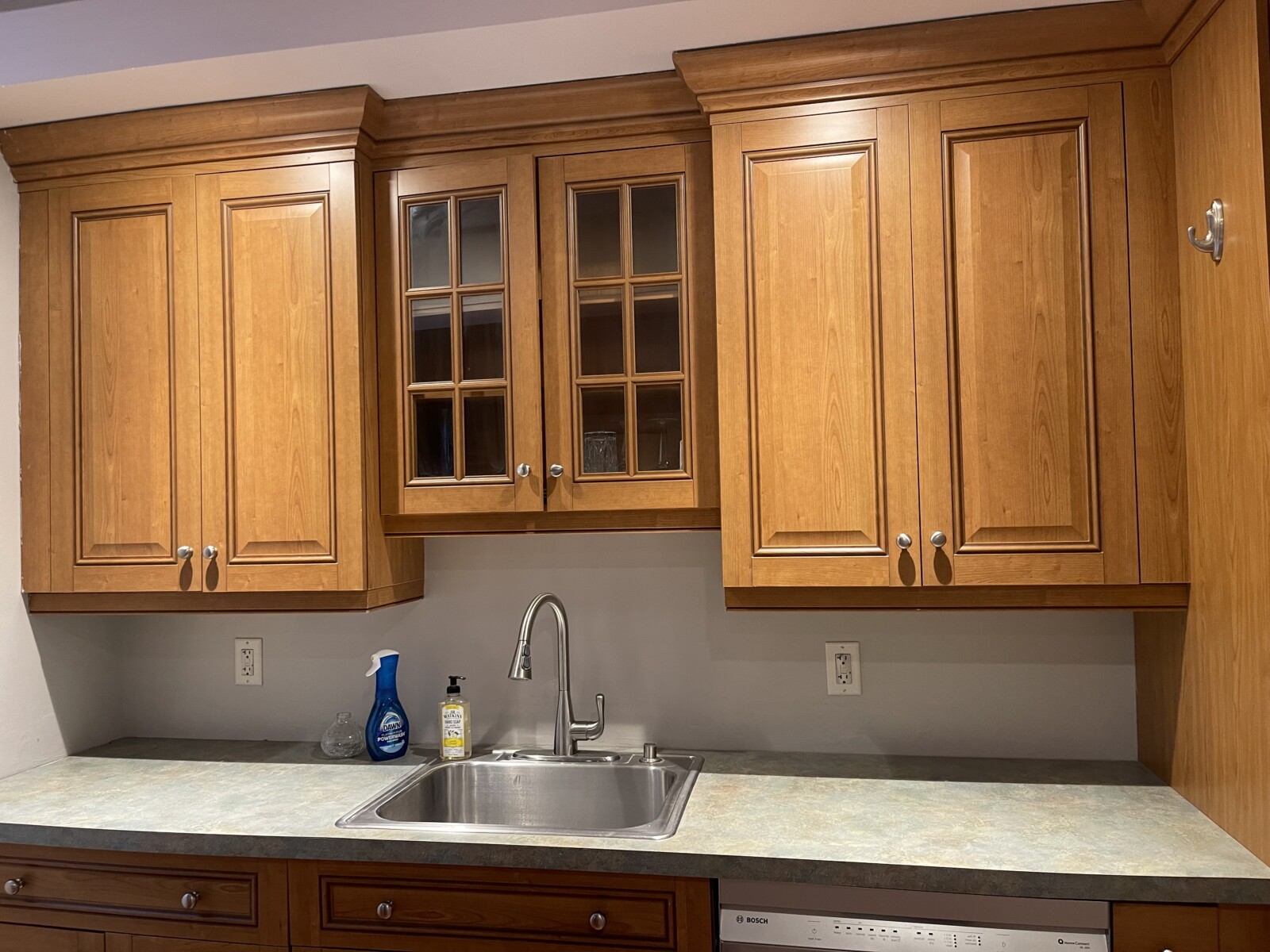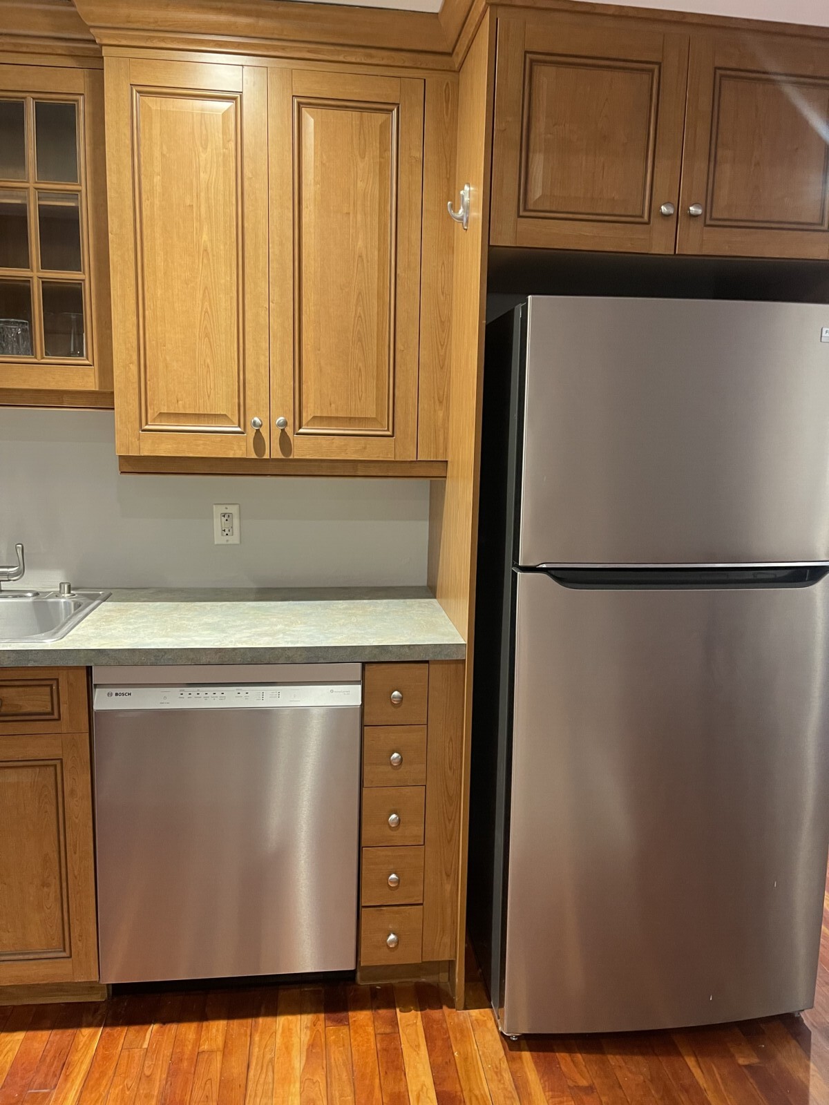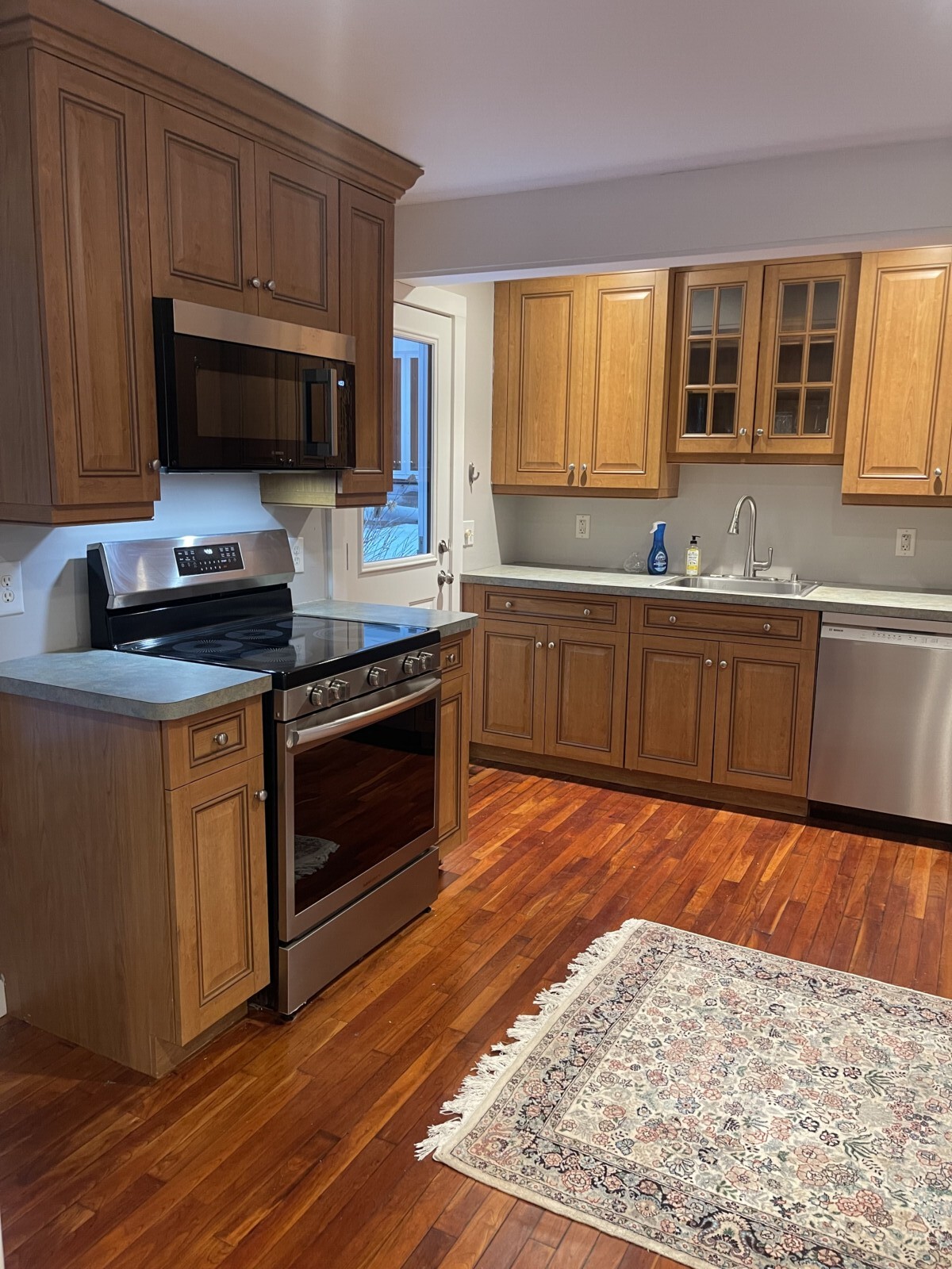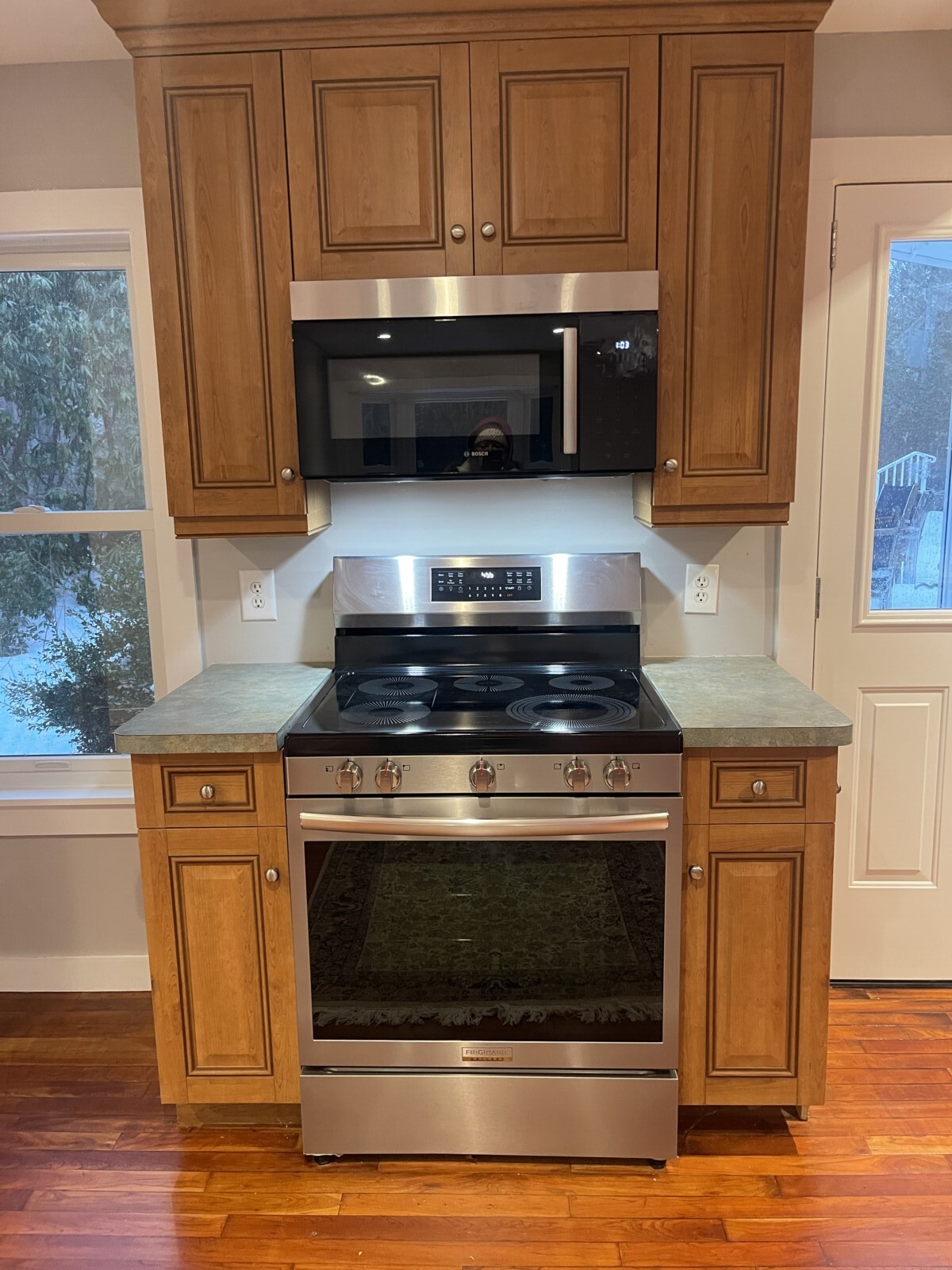- Brand-name kitchen appliances including stove and refrigerator; Bosch microwave and dishwasher.